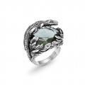 Dal dialogo fra la luminosità del quarzo verde e la brunitura dell’argento fuso a cera persa nasce questo anello iconico. Un piccolo capolavoro animalier ove il coccodrillo si adagia su una vegetazione esotica. Un gioiello disegnato e realizzato, a mano, completamente in azienda.