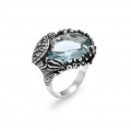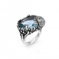 Questo anello iconico nasce dal dialogo fra la luminosità del quarzo azzurro e la brunitura dell’argento fuso a cera persa, che prende vita in guisa di un micromondo marino, ove una tartaruga si muove tra coralli e anemoni. Un piccolo capolavoro realizzato completamente a mano.