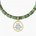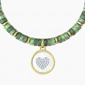 Bracciale elastico con cilindri in diaspro verde alternati ad anelli in acciaio color oro giallo e ciondolo satinato tondo con rifinitura lucida e cuore in cristalli.
