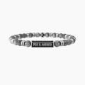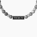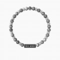 • Bracciale elastico con sfere in agata grigia alternata ad anelli in acciaio e elemento cilindrico di colore nero;