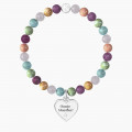 • Bracciale elastico con pietre multicolor con ciondolo a forma di cuore in acciaio satinato, cristallo e scritta “Grazie Maestra”;