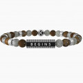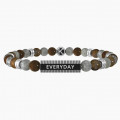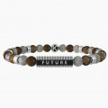 Bracciale elastico con sfere in occhio di tigre e agata grigia alternate e anelli in acciaio. Elemento cilindrico di colore nero con incisione.