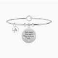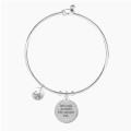 Bangle in acciaio con ciondolo lucido e satinato con cristallo e scritta “Ieri, oggi, domani. Per sempre noi”.